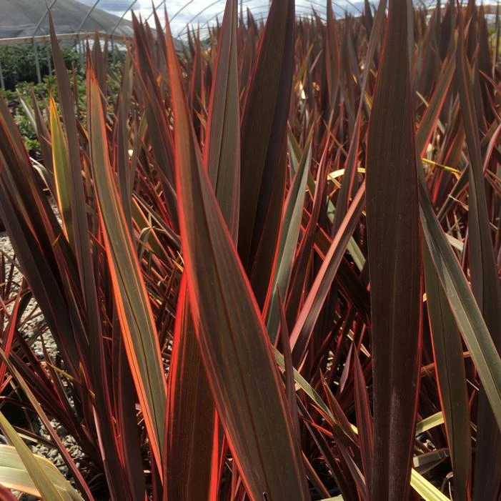 Buy Sundowner New Zealand Phlax online. This ornamental grass will definitely highlight your landscape! Each dark colored blade is produced pink in color that turn bronze to dark green as they mature, that will retain a pink margin. It’s appearance in the garden is stunning, and will remind you of Oklahoma sunsets! This upright grower can start to arch as leaves get longer, and it’s an excellent specimen and mass planting grass. Extremely drought and heat tolerant, too, although not as cold tolerant as it’s cousin, Mat’s Merlot New Zealand Phlax.